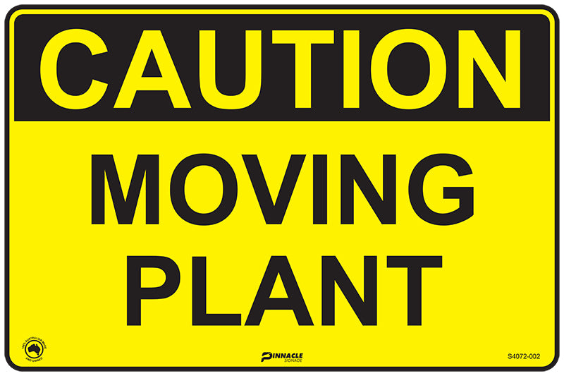 - Includes pictogram and black text that reads CAUTION MOVING PLANT.