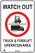 - Features bold black text with clear pictos of a truck and forklift to reinforce the safety message.