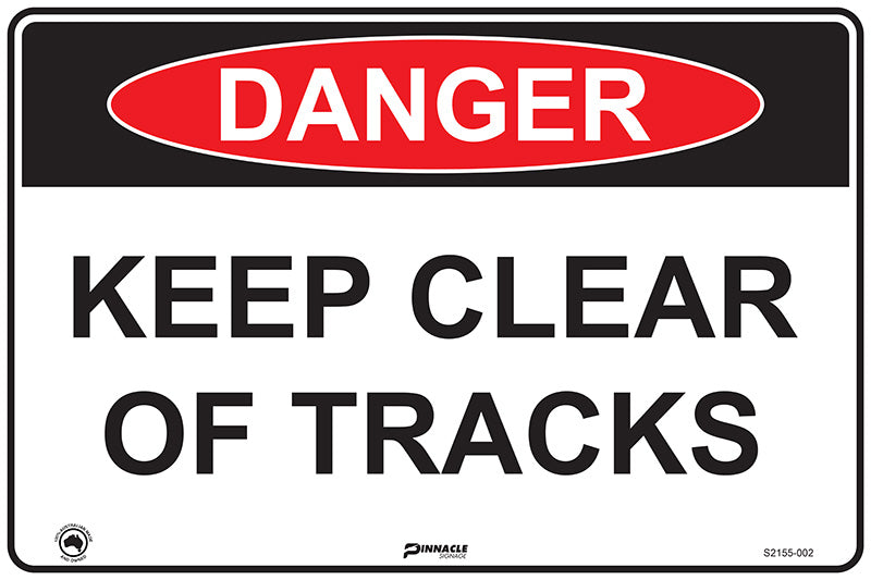 - Includes Danger Header and black text that reads KEEP CLEAR OF TRACKS.