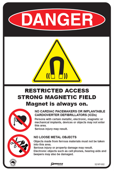 - Includes pictogram and black text that reads DANGER RESTRICTED ACCESS STRONG MAGNETIC FIELD.