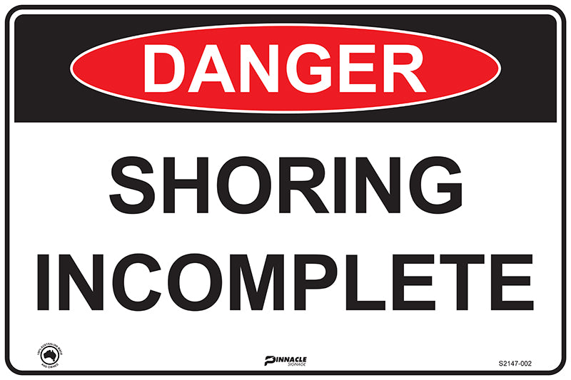 • Includes Danger Header and black text that reads SHORING INCOMPLETE.