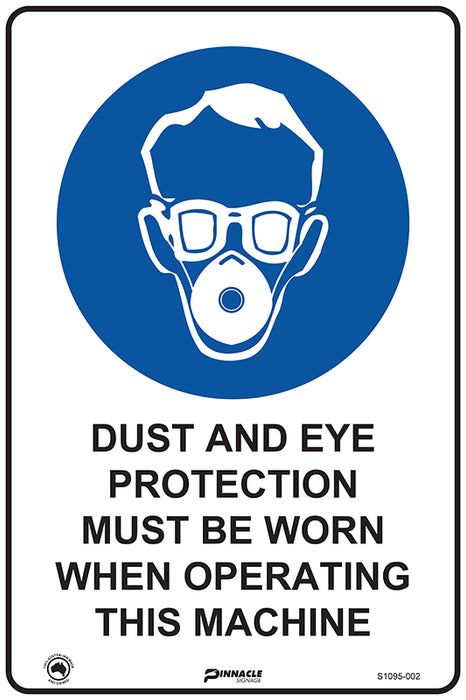 • The sign serves as a warning to individuals operating machinery that both a dust mask and eye protection must be worn.