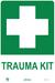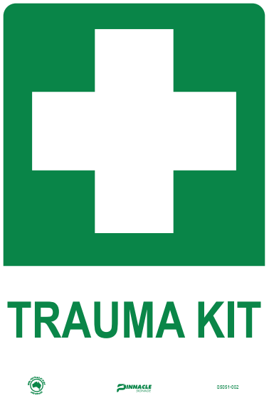 - Includes a white medical cross symbol and green text that reads TRAUMA KIT.